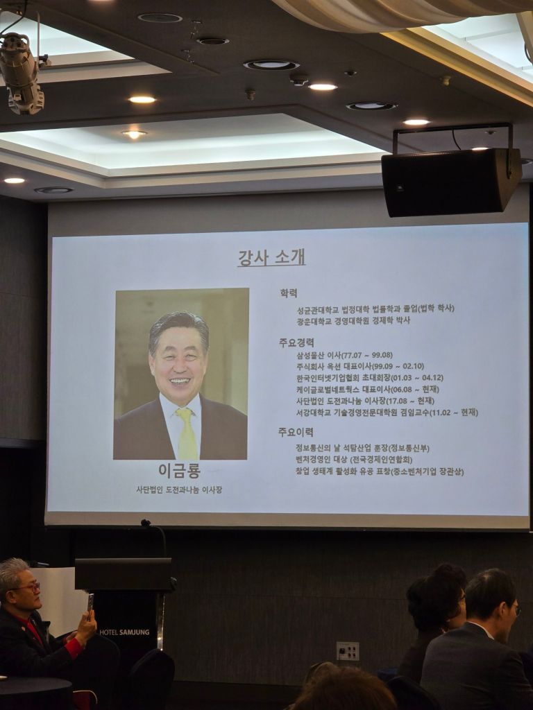 카네기조찬에서 이금룡 박사님의 강연을 경청하며, 경영과 지식의 심오한 세계를 통찰하는 귀중한 시간을 가졌습니다. 박사님의 풍부한 경험과 깊이 있는 지식이 녹아든 말씀은, 현대 경영의 복잡한 도전과제를 헤쳐 나가는 데 필요한 지혜와 영감을 제공했습니다. 이번 강연을 통해 얻은 교훈과 통찰은 제 경영 철학을 한층 더 성숙시키는 계기가 되었으며, 앞으로의 도전에 큰 용기와 힘을 실어줄 것입니다.